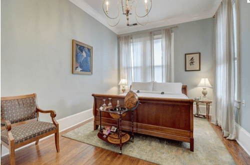 Vidalia is our newest room at the very top of the house. This is our coziest bedroom, best for a single person or people who are traveling light as you will have to climb 3 flights of stairs. The room is full of antique treasures like a Victorian Armoire for your clothes and storage. Along the walls are old newspaper clippings from 100 years ago.