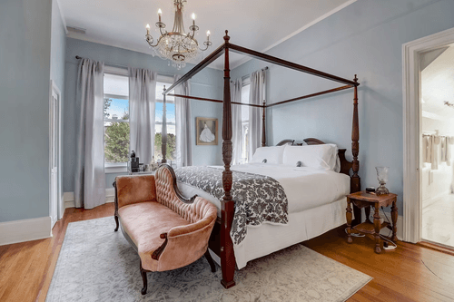 Savannah, our largest guest room, is bright and airy with tall ceilings and windows, a crystal chandelier, and an ornamental fireplace. You'll remark about the beautifully finished century-old hard-wood floors. The private bath has both a shower and claw foot tub combo. A flat screen TV with cable sits on the wall. The bed has an organic Avocado Mattress.